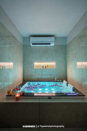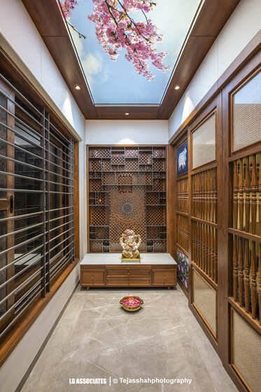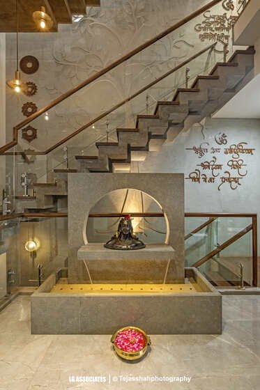 - As you enter, you are welcomed by an open and spacious living area with cozy furniture and soft lighting. The heart of the home is a peaceful water body featuring an Aadiyogi statue, with a bilva tree wall showing the seven chakras – creating a spiritual and grounding space for the family.